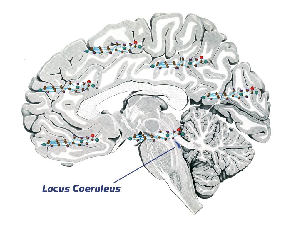 FIGURE 1: The human brain (right hemisphere shown from the perspective of the interhemispheric fissure), bathed in about 139,721,577,726,218,097 LSD molecules (100µg) which go on to attach themselves more or less temporarily to various brain receptors. Only a few LSD molecules shown, and not to scale!. The human brain may contain as many as 100 billion neurons in total, so we see there are plenty of LSD molecules to go around, even if only a small number from the 100µg dose actually arrive at the neuroreceptors involved with psychedelic experience.